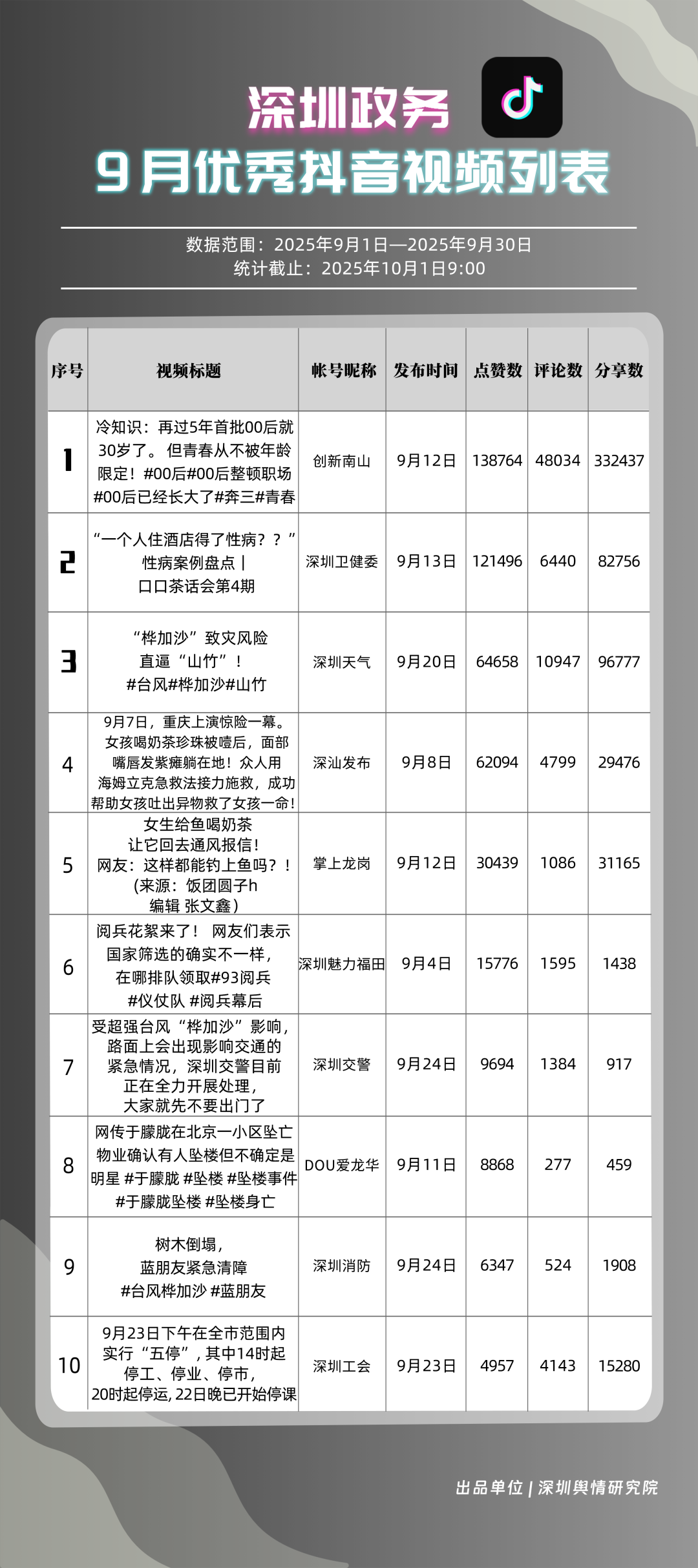 9月,獲得“優(yōu)秀政務(wù)抖音號”稱號的是“創(chuàng)新南山”“深圳天氣”“深圳衛(wèi)健委”“深圳魅力福田”“深汕發(fā)布”“掌上龍崗”“DOU愛龍華”“深圳工會”“青春深圳”“深圳交警”?!皠?chuàng)新南山”以一條有關(guān)“青春不被年齡限定”的視頻獲得超34萬次轉(zhuǎn)發(fā),超14萬次點(diǎn)贊,助力其在抖音榜單居于榜首;“深圳天氣”多條臺風(fēng)相關(guān)視頻吸引大量網(wǎng)民關(guān)注、互動,在抖音平臺得分超98分;“深圳衛(wèi)健委”“深圳魅力福田”“深汕發(fā)布”等賬號緊隨其后,得分均在92分以上。上榜的優(yōu)秀政務(wù)抖音號以“有溫度”的敘事表達(dá),將宣傳、服務(wù)內(nèi)容轉(zhuǎn)化為網(wǎng)民喜聞樂見的視頻,收獲高點(diǎn)贊、高轉(zhuǎn)發(fā)的流量實(shí)績,更在評論區(qū)形成了良性互動生態(tài),深度運(yùn)營收獲了較好成果。