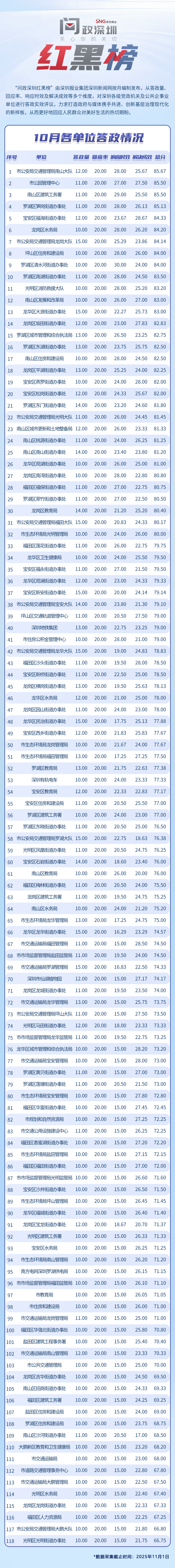 為探尋媒體如何精準賦能基層治理現(xiàn)代化的“深圳路徑”,深圳報業(yè)集團正式掛牌成立“問政深圳”工作室,旨在進一步推動網(wǎng)絡問政工作的高效開展。為確保相關工作更加契合實際需求,深圳報業(yè)集團深圳新聞網(wǎng)按照“最快速度辦結”的總體要求,將原有月度榜單創(chuàng)新升級為“問政深圳紅黑榜”,并對評分體系進行了細致優(yōu)化。該榜單從答政量、回應率、響應時效及解決成效等多個維度,對深圳各級黨政機關及公共企事業(yè)單位進行答政實效評議,力求打造政府與媒體攜手共進、創(chuàng)新基層治理現(xiàn)代化的新樣板,從而更好地回應人民群眾對美好生活的熱切期盼。