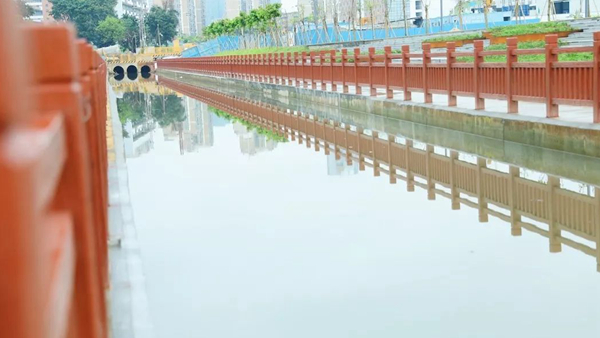 走在石圍涌岸邊,看到兩岸新修的朱紅色仿木欄桿與藍天、清水、綠草呼應,繪就了一幅自然、和諧、美麗的生態(tài)畫卷。